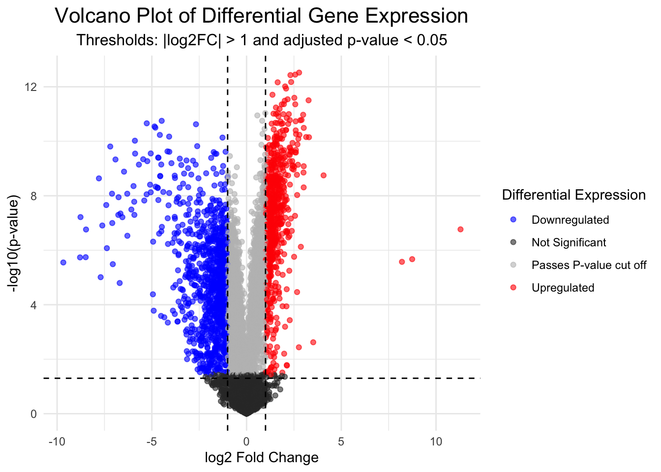 scale_color_manual(values = c("Upregulated" = "red", "Downregulated" = "blue", "Not Significant" = "grey20", "Passes P-value cut off" = "grey")) +