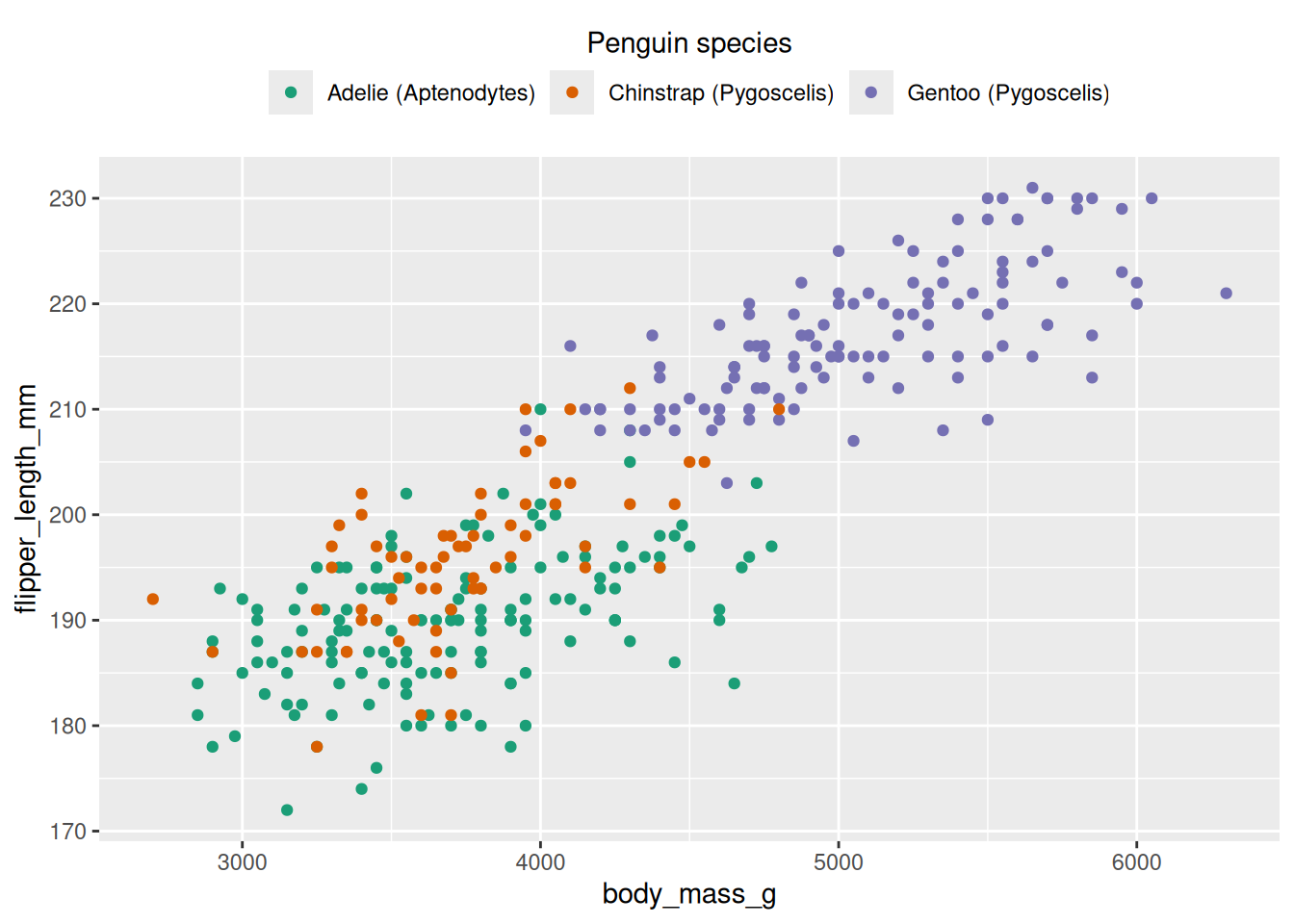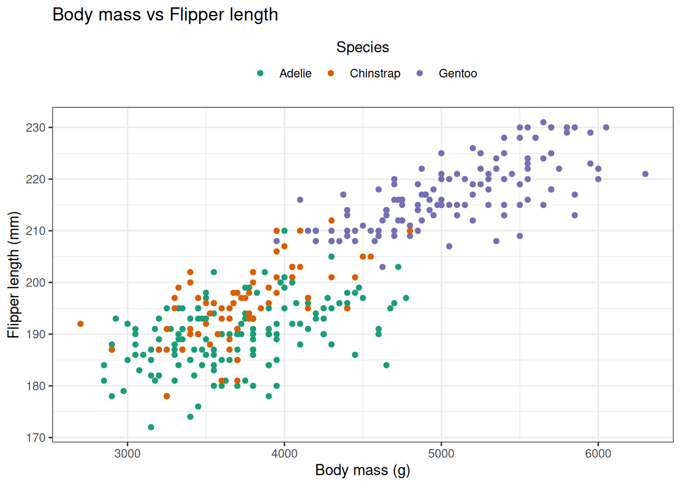ggplot(penguins, aes(x = body_mass_g, y = flipper_length_mm, colour = species)) +