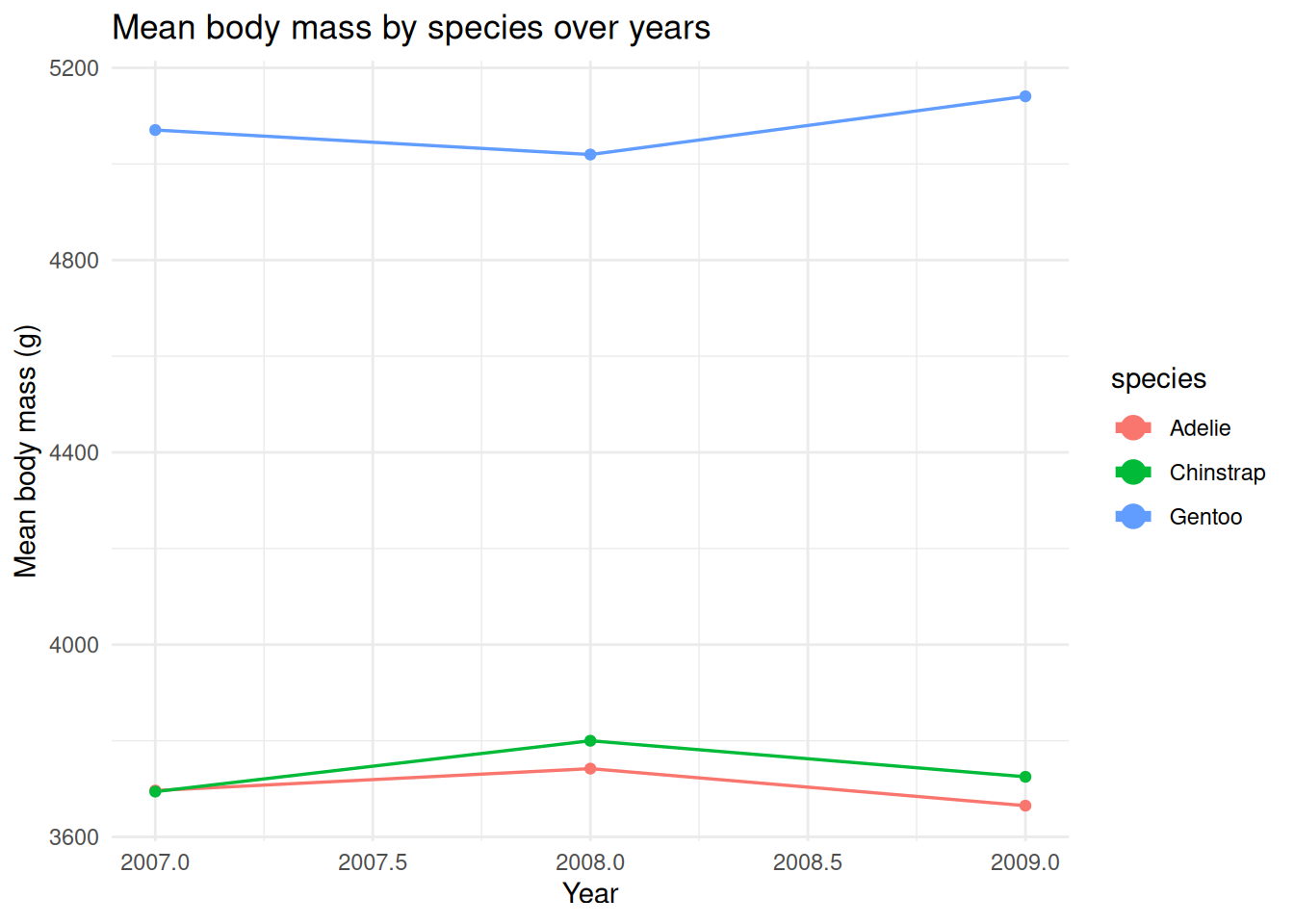 labs(title = "Mean body mass by species over years", x = "Year", y = "Mean body mass (g)") +