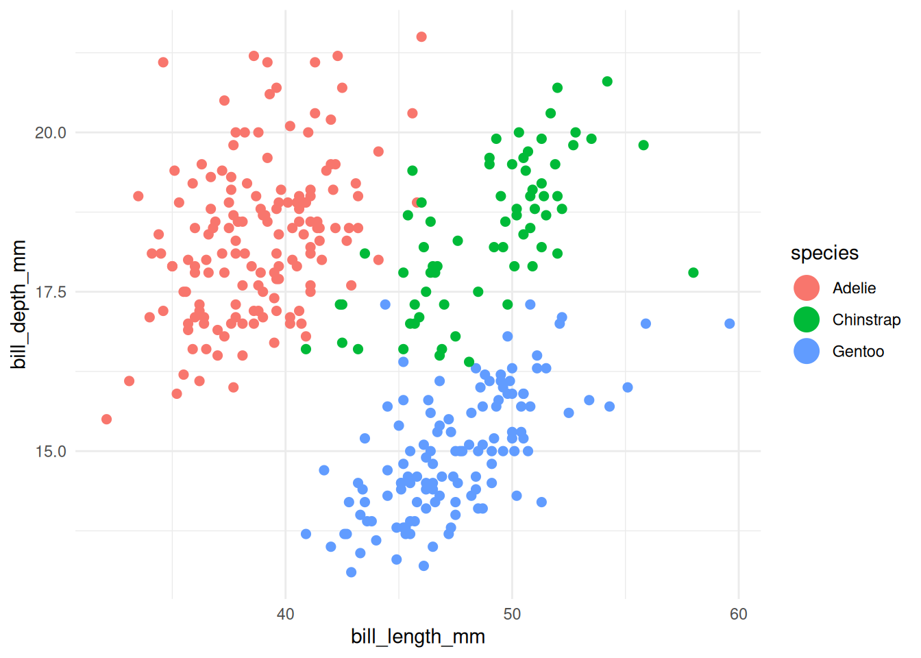 ggplot(penguins, aes(x = bill_length_mm, y = bill_depth_mm, colour = species)) +