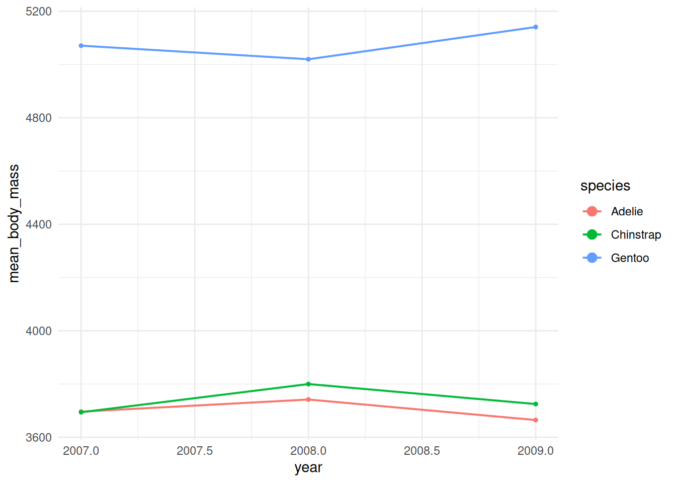 ggplot(df_line, aes(x = year, y = mean_body_mass, colour = species, group = species)) +