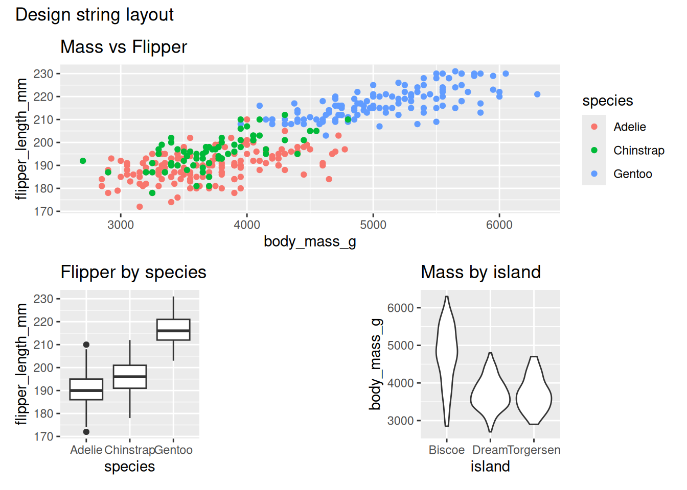 geom_violin(na.rm = TRUE) + ggtitle("Mass by island")- An example two-column layout where p1 takes left column and p2/p3 stack on the right